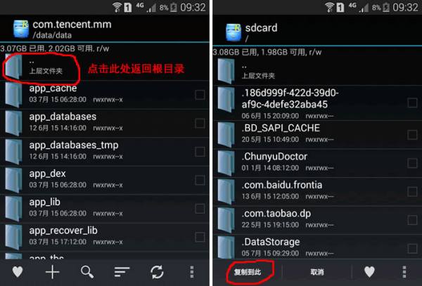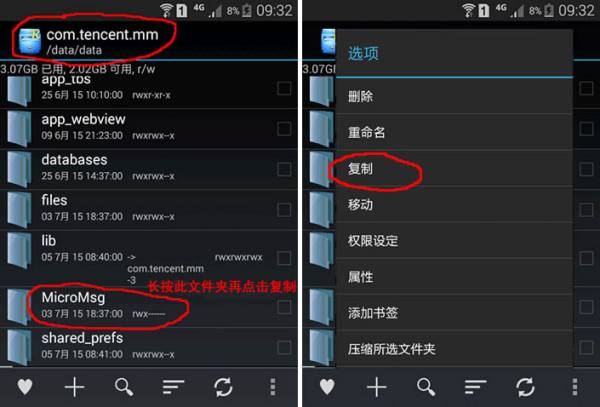 第4步:在安卓手机上打开刚安装的RE管理器,进入到微信数据所在的目录data/data/com.tencent.mm,然后对该目录下的MicroMsg文件夹进行复制。