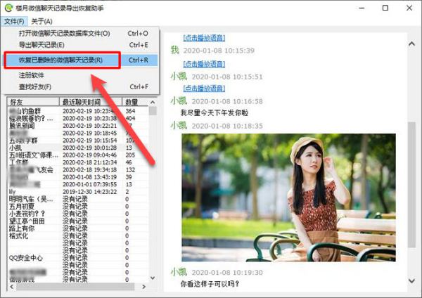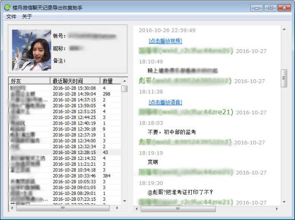 第6步:此时,该微信号中所有好友的网名,最近聊天时间,及聊天记录数量就显示在左边了,我们点击任意好友后,上方会显示出该好友的头像及对应的微信号,右边则会显示与该好友的所有聊天内容。我们接着点击“文件”菜单,再点击下拉菜单中的“恢复已删除的微信聊天记录”。