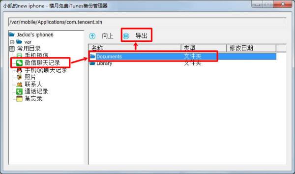 第4步:点击左侧的“微信聊天记录”,然后将右边的Documents文件夹导出到电脑上任意目录下。