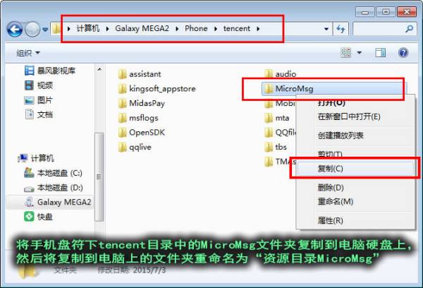 第1步:请先将安卓手机连接到电脑上,打开手机所在的盘符,并进入tencent目录,再将该目录下的MicroMsg文件夹复制并粘贴到电脑上,然后将复制到电脑上的MicroMsg文件夹重命名为“资源MicroMsg”。