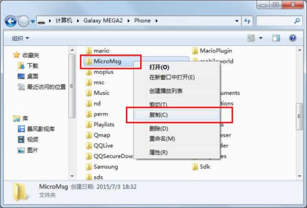第6步:再次把安卓手机连接到电脑上,进入手机盘符后,会发现多了一个MicroMsg文件夹,我们再次将该文件夹也复制到电脑上。并把此次复制到电脑上的MicroMsg文件夹重命名为“数据MicroMsg”。