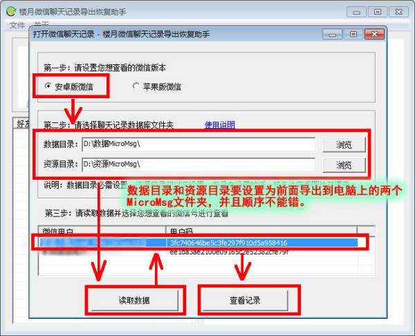 第7步:打开“楼月微信聊天记录导出恢复助手”软件,微信版本设置为“安卓版微信”,数据目录和资源目录则设置为前面复制到电脑上的两个MicroMsg文件夹(顺序不能错),然后点击“读取数据”按钮,再在上方列表中选择一个想查看的微信号后,点击“查看记录”按钮。