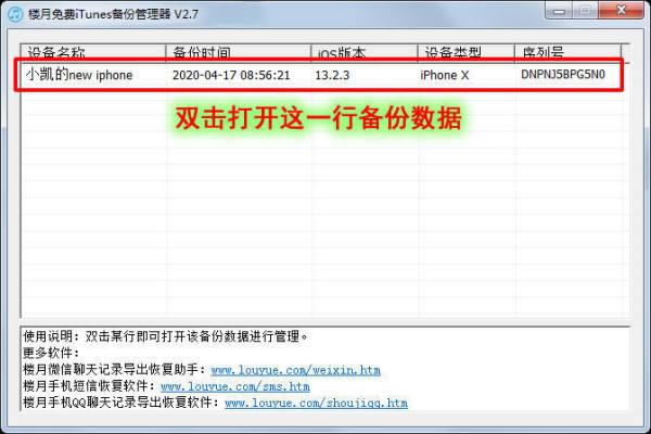 第3步:安装并打开“楼月免费iTunes备份管理器”(点击此处下载),双击打开刚备份下来的那一行备份数据,如下图所示。