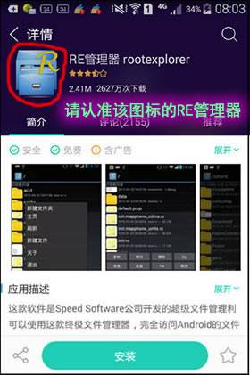 第3步:接下来请在安卓手机上安装“RE管理器rootexplorer”软件,可在手机上搜索并下载该软件即可,该软件是由国外开发者所开发,是目前功能最强大的手机文件管理器软件,目前国内有很多仿冒软件,但一般图标和原版软件会有不同,因此请认准下图所示带R字图标的RE文件管理器软件。