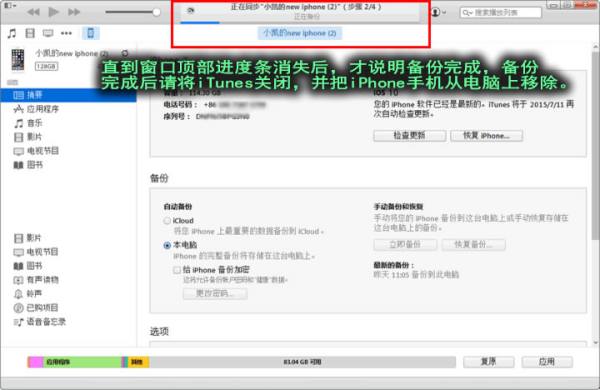 第2步:备份可能较久,请耐心等待,备份完成后,窗口上是不会弹出任何提示窗口的。当您看到下图窗口顶部的进度条消失后,则说明备份已经完成,此时可以将苹果手机从电脑上移除,并关闭掉iTunes软件。