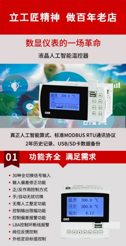 OHR-G300/G300R系列智能温控仪控温精度基本达±0.1℃,无超调、欠调,达国际先进水平。适用于需要进行高精度控制系统,可对温度、压力、流量、液位、速度等测量信号进行数字量显示控制;可带外给定(或阀位)控制,可取代伺服放大器直接驱动执行机构;可进行编程控制,根据生产过程的要求,按照一定的程序曲线进行控制,最多可分61段曲线对控制对象进行监测、控制、记录与远传。