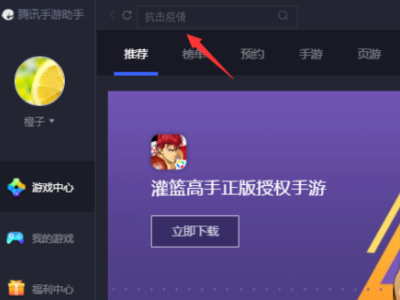 1、首先在电脑上打开腾讯手游助手,点击页面上方的搜索框,如图所。