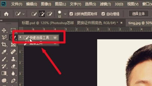 1、直接在相关窗口那里,通过快速选择工具点击需要换底色的证件照。