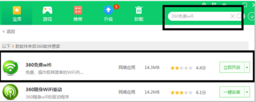 硬件安装完成后,我们点击打开360软件管家,在360软件管家首页上方的搜索框内搜索360免费软件,在弹出的下拉菜单里我们点击下载360免费wifi。