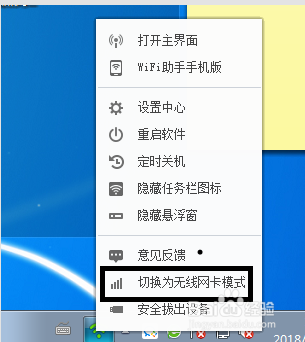 此时360免费wifi软件被打开,软件被打开后默认的模式是wifi模式,我们此时右键点击右下方360免费wifi软件的图标,此时会弹出一个菜单栏,在此菜单栏里点击选择切换为无线网卡模式。