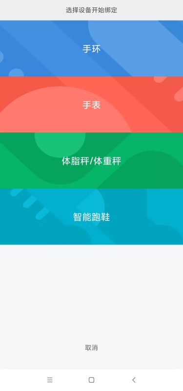 简单说一下绑定手环与APP的操作:首先在手机上安装“小米运动”APP,打开APP,在右下角“我的”-“添加设备”,就到达下图界面,点击“手环”那一项,按照提示语完成绑定操作即可。