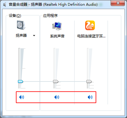三、另外还可以看看音量合成器,扬声器和话筒都不允许禁用,下图是全部启用的情况。