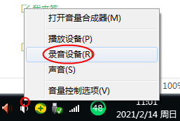 一、在右下角音量图标(小喇叭)上点右键,点录音设备。
