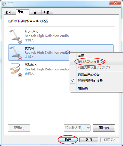 二、看看录音设备是否插好了,下图是没插好的情况。然后在想要的录音设备上点右键,点击“设置为默认设备”,就可以录到声音了。