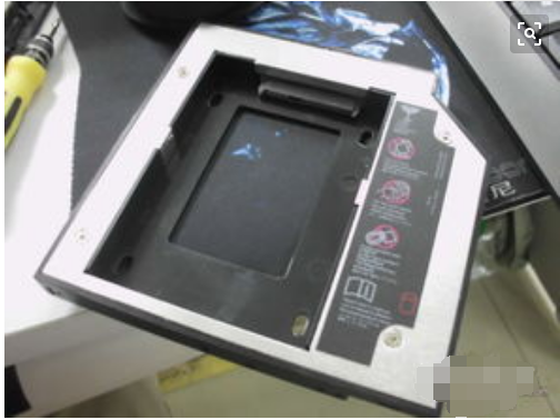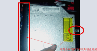 5.将笔记本光驱上的卡扣和后面黑色外壳拆下 装到硬盘托架上 将笔记本自带硬盘安装到托架上。(黑色外壳拆法 两手平拿住光驱 有字的一面对着自己 将黑色外壳往下掰即可拆下)。