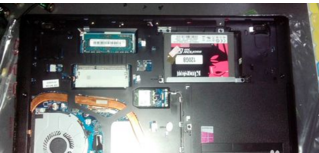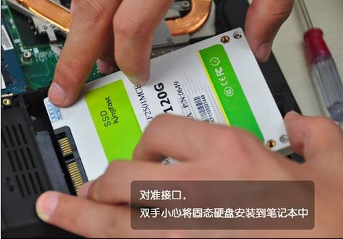 5、取出笔记本电脑里原来的机械硬盘之后,便可将新购买的固态硬盘重新安装笔记本当中,由于固态硬盘与原来机械硬盘基本相同,并且接口也相同,因此安装就变得相当简单了。