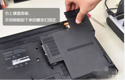 6.将装有硬盘的硬盘托架安装到笔记本上拧好螺丝,盖上后盖 往里面平推 安装到位后拧紧螺丝 到此就安装完成了。