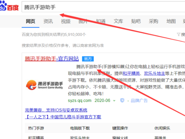 1、首先打开浏览器搜索腾讯手游助手并且下载。