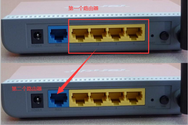 第七步、两个路由器的WAN口使用网线连接,如下图所示: