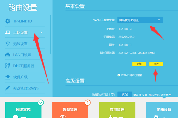 第三步、WAN口连接类型为自动获取IP保存,如下图所示: