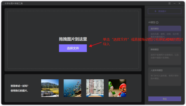 1.启动牛学长图片修复工具后,可以单击“选择文件”或直接拖动图片将原始模糊的图片导入到牛学长图片修复工具中。