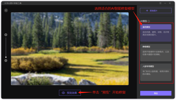 2.右侧选择适合用户的AI智能修复模型,然后单击“预览”开始修复,由于工具在处理图片,可能需要等待几秒钟。