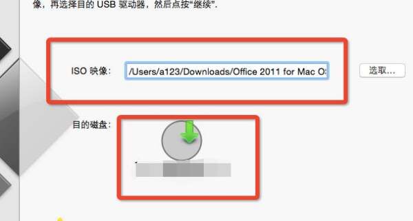 4、接着在这里可以看到当前插入到 Mac 的 U 盘,在 ISO 镜像一栏,点击“选取”按钮。