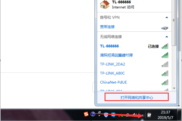 1、点击电脑右下角的控制面板中的网络连接选项并点击页面中的打开网络共享中心,进入网络共享中心。