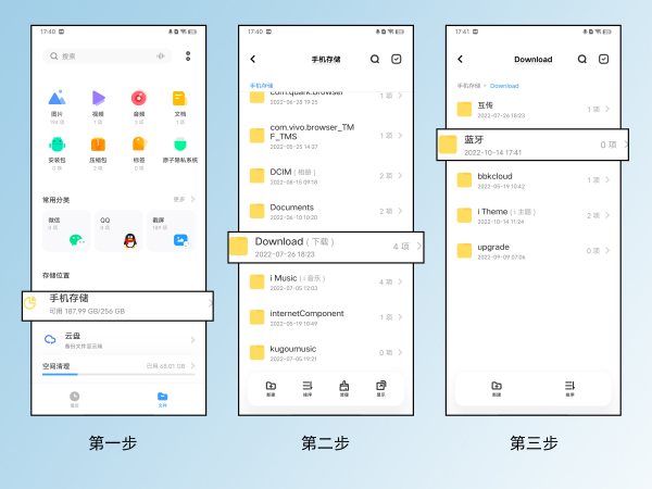 通过蓝牙传输的文件,可以在文件管理--手机存储--Download--蓝牙文件夹中找到。
