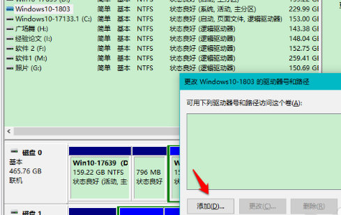 2、在win10-1803弹出的更改驱动器字母和路径对话框中点击:添加。