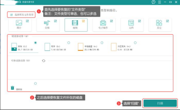 步骤1:在电脑上安装软后,选择电脑要恢复的文件类型(全部选择可以得出更全面的扫描数据)。在硬盘驱动器和可移动驱动器这里,就根据你丢失文件之前保存的位置来选择。开始【扫描】。