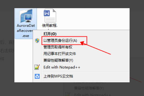1、首先我们打开电脑里的浏览器百度搜索并下载图示强力恢复软件,用鼠标右键点击软件图标选择《以管理员身份运行》软件。