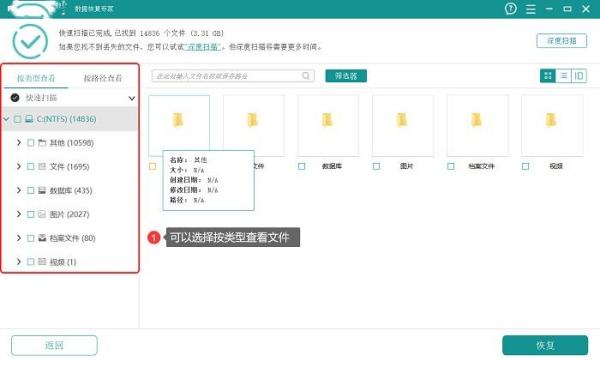 步骤2:在恢复文件前,在页面左侧可以选择按类型或者路径来查看各类文件数据,建议点击【按类型查看】更直观方便。