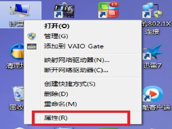 2、关闭软件。找到桌面上“计算机”,按右键,选择"属性。