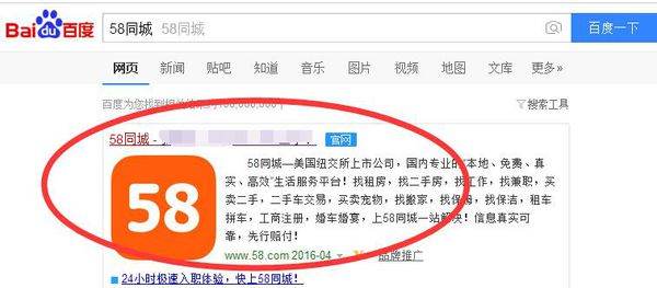 1、打开百度搜索,在搜索框中输入“58同城”,即可在搜索结果中找到官网。