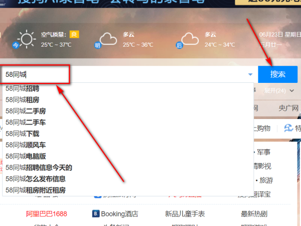 1、在浏览器的搜索栏键入“58同城”,完成之后,点击搜索。