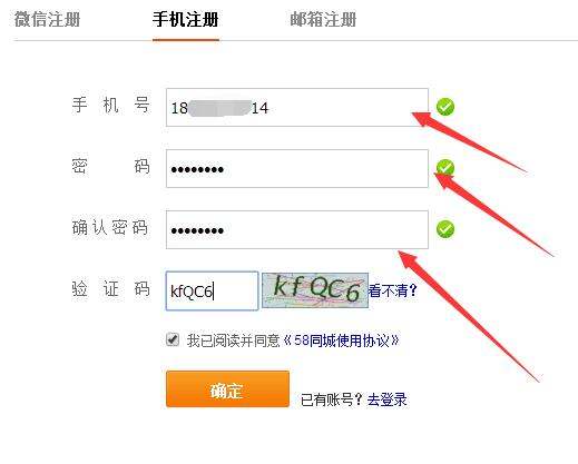 3、如果没有“58同城”的账号,可以点击注册,进入注册页面根据提示输入手机号,设置用户名。
