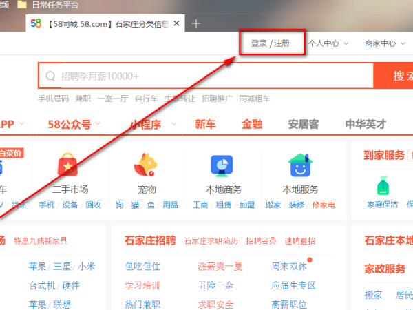 1、进入【58同城】官网,然后点击进入到登录页面;