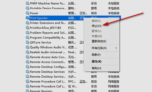 3.发现右边的printspooler项并单击右键选择“停止”。