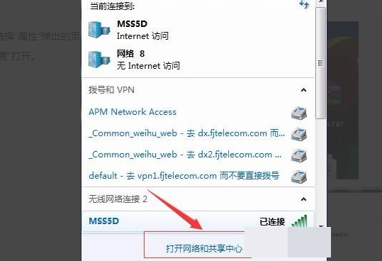 4、在电脑网络连接点开“打开网络和共享中心”: