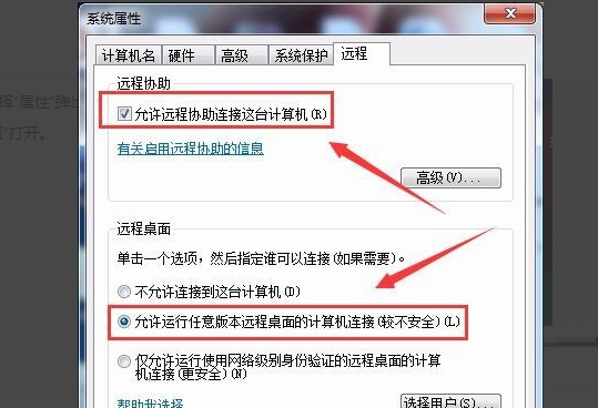3、在远程设置页面,远程协助:勾选“允许远程协助连接这台计算机”,远程桌面:选择“允许运行任意版本远程桌面的计算机连接: