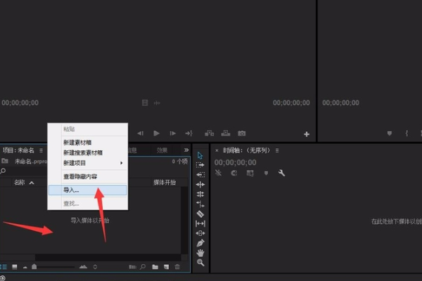 4、然后需要打开pr,在项目窗口中的空白处鼠标右键,选择“导入”。