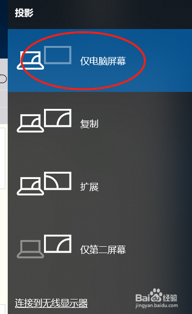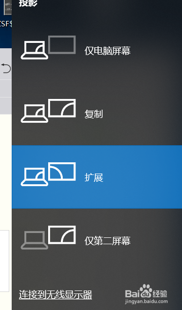 6、于是我们使用win +p键打开投影扩展显示设置面板,发现问题出在这里,我们并未设置扩展屏幕。