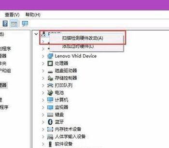 5.右键点击选择页面中的计算机名称,在弹出的菜单中选择“扫描硬件改动”选项,让系统自动检测硬件设备对系统的改动。