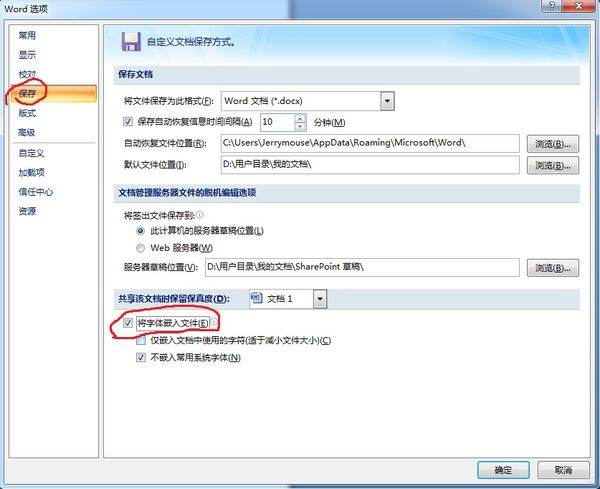 2、单击“保存”,将右侧的“将字体嵌入文件”打勾,然后“确定”