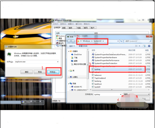 3、接下来到任务管理器的左上角点“文件”→“新建任务”再打开“浏览”然后到C盘→window→system32也就是c:/windows/system32文件夹的位置找到"systray.exe"此程序点打开,再点确定。