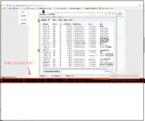 2、点击进程选项,然后找到"explorer.exe"进程结束掉。然后任务栏和桌面就会消失关闭。注意:任务管理器不要关闭,结束了"explorer.exe"之后如果不小心把任务管理器关闭了,可用快捷键打开:Ctrl+Alt+Del,如果任务管理器北其他画面挡住了,可以点Alt+Tab切换出来。
