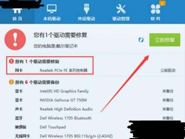 或者我们下载一个驱动管家,这里看自己喜好,驱动人生、驱动精灵都是可以得。然后我们扫描我们的驱动。会发现我们的网卡驱动出现了问题,然后我们点击修复。