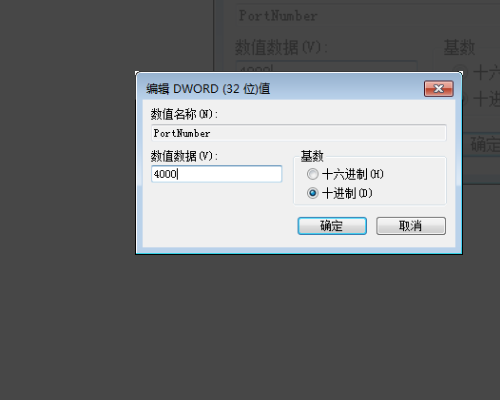 1、找到:[HKEY_LOCAL_MACHINE\SYSTEM\CurrentControlSet\Control\Terminal Server\Wds\rdpwd\Tds\tcp] 双击右边 PortNumber——点十进制——更改值为:4000 —— 点确定。