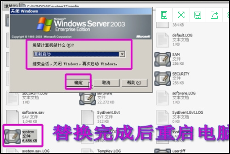 3、打开目录:c:\WINDOWS\system32\config,然后把U盘的system文件替换进去。